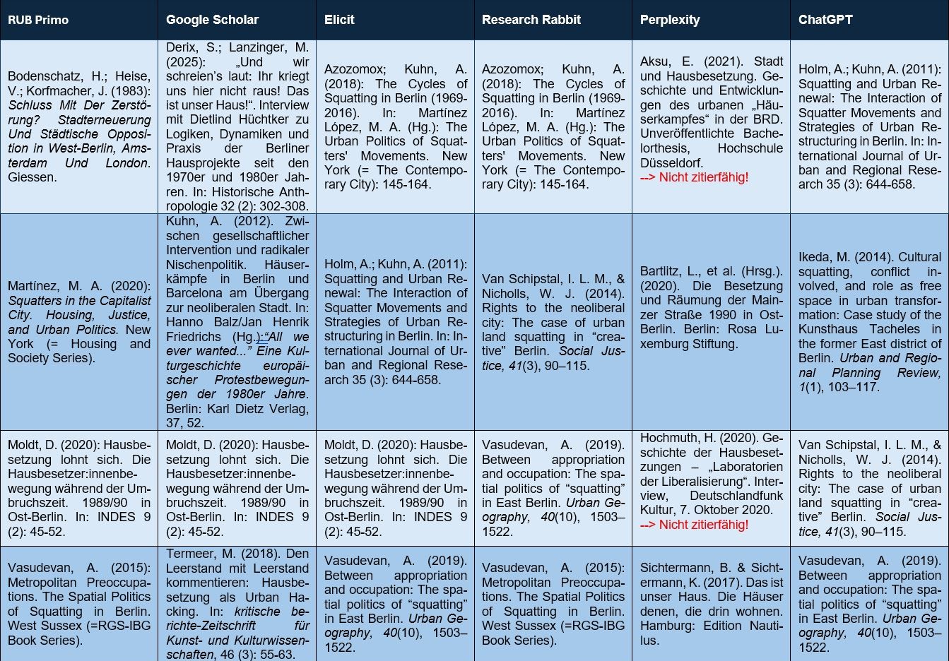 Wir haben mit den genannten Recherchetools nach Forschungsliteratur zum gewählten Beispielthema „Hausbesetzung in Berlin“ recherchiert. Das hier sind einige der Ergebnisse im Vergleich dargestellt: